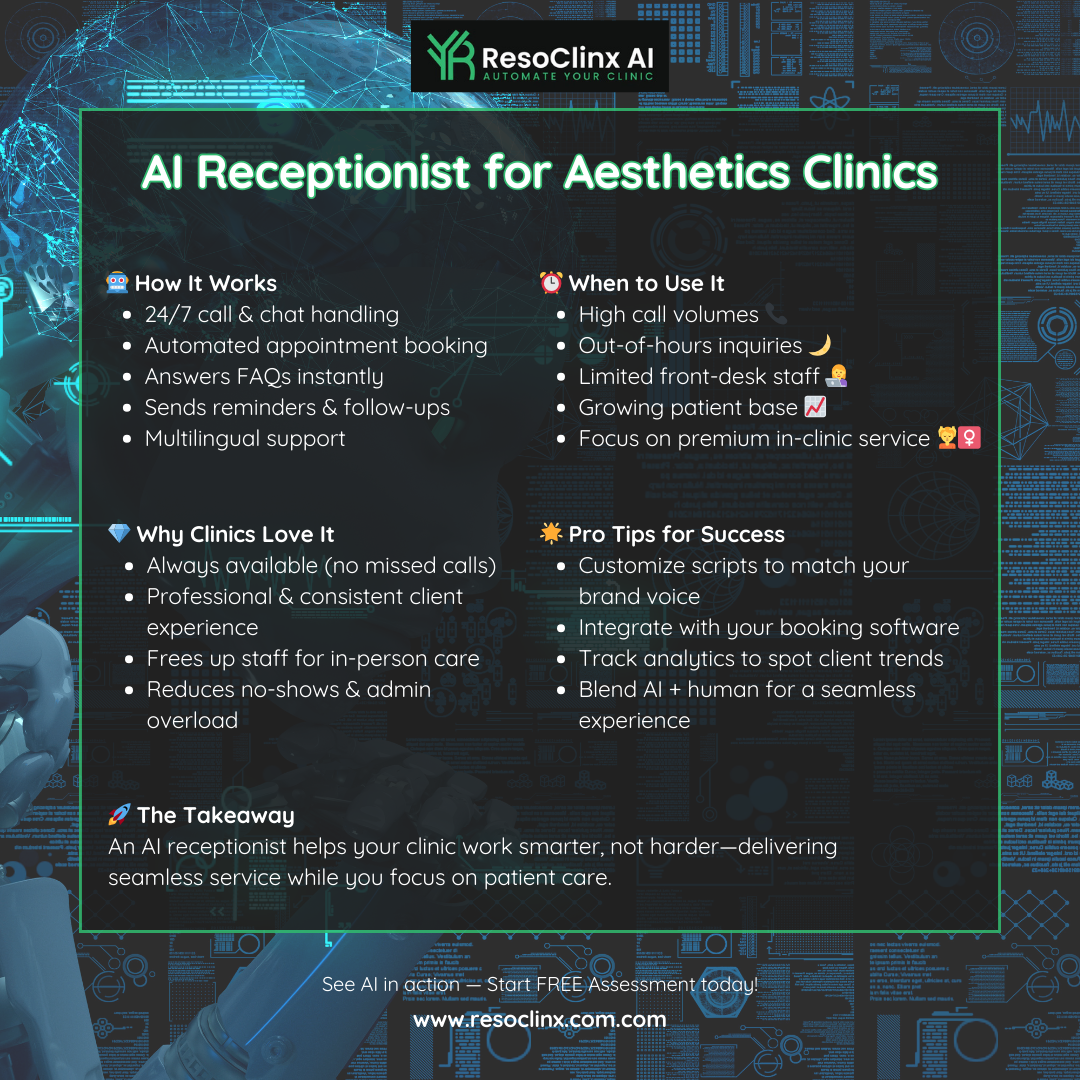 Running an aesthetics clinic means juggling consultations, treatments, follow-ups, and—of course—endless calls and appointment requests. What if you could keep your front desk running smoothly 24/7 without adding extra staff? That’s exactly where an AI receptionist comes in.