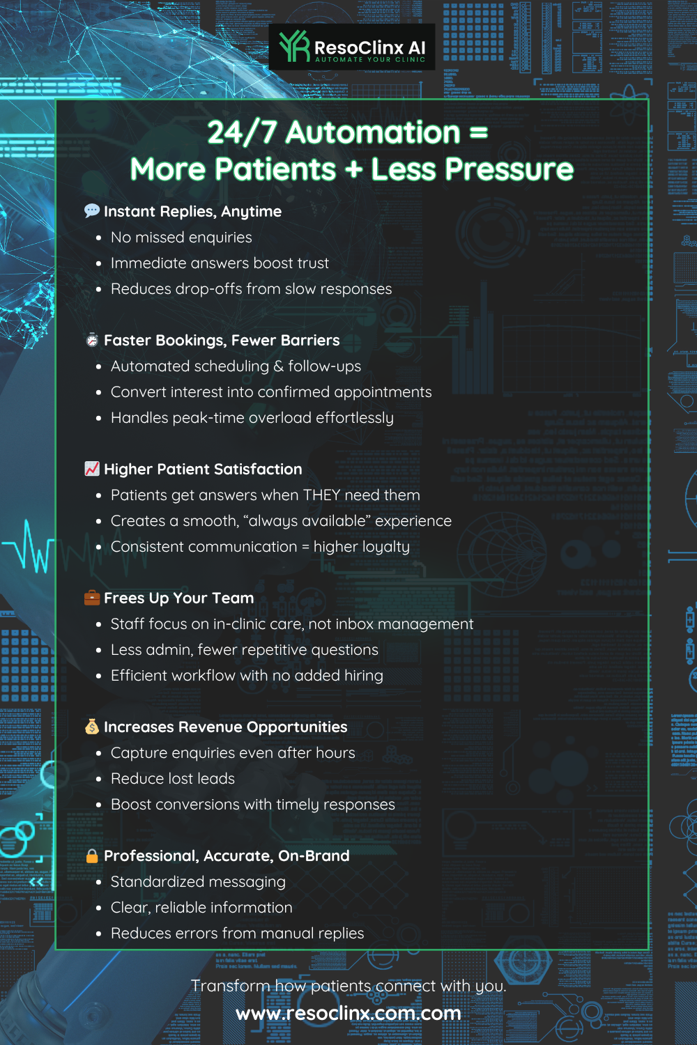This shift allows your clinic to operate more efficiently, potentially reducing administrative costs. Instead of hiring additional reception staff, especially for out-of-hours cover, an AI system provides continuous support at a predictable cost. This means you can capture more enquiries and bookings, even when your clinic is closed, turning potential leads into appointments.
