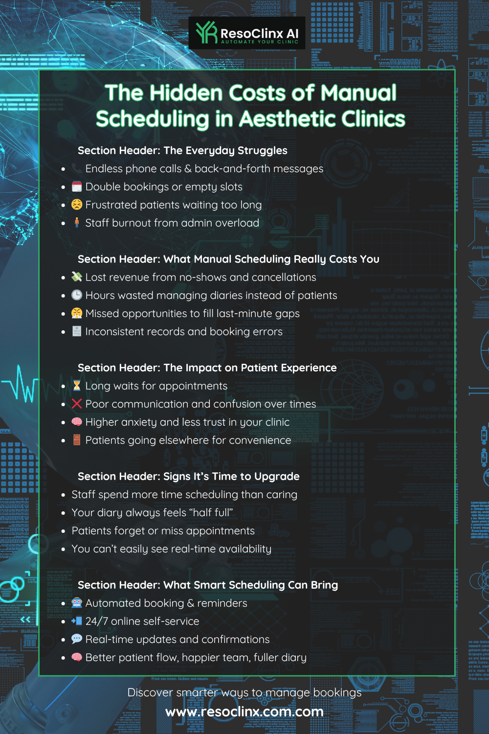 - AI scheduling systems are transforming aesthetic clinic marketing by reducing no-shows, improving patient experience, and freeing up staff time.
