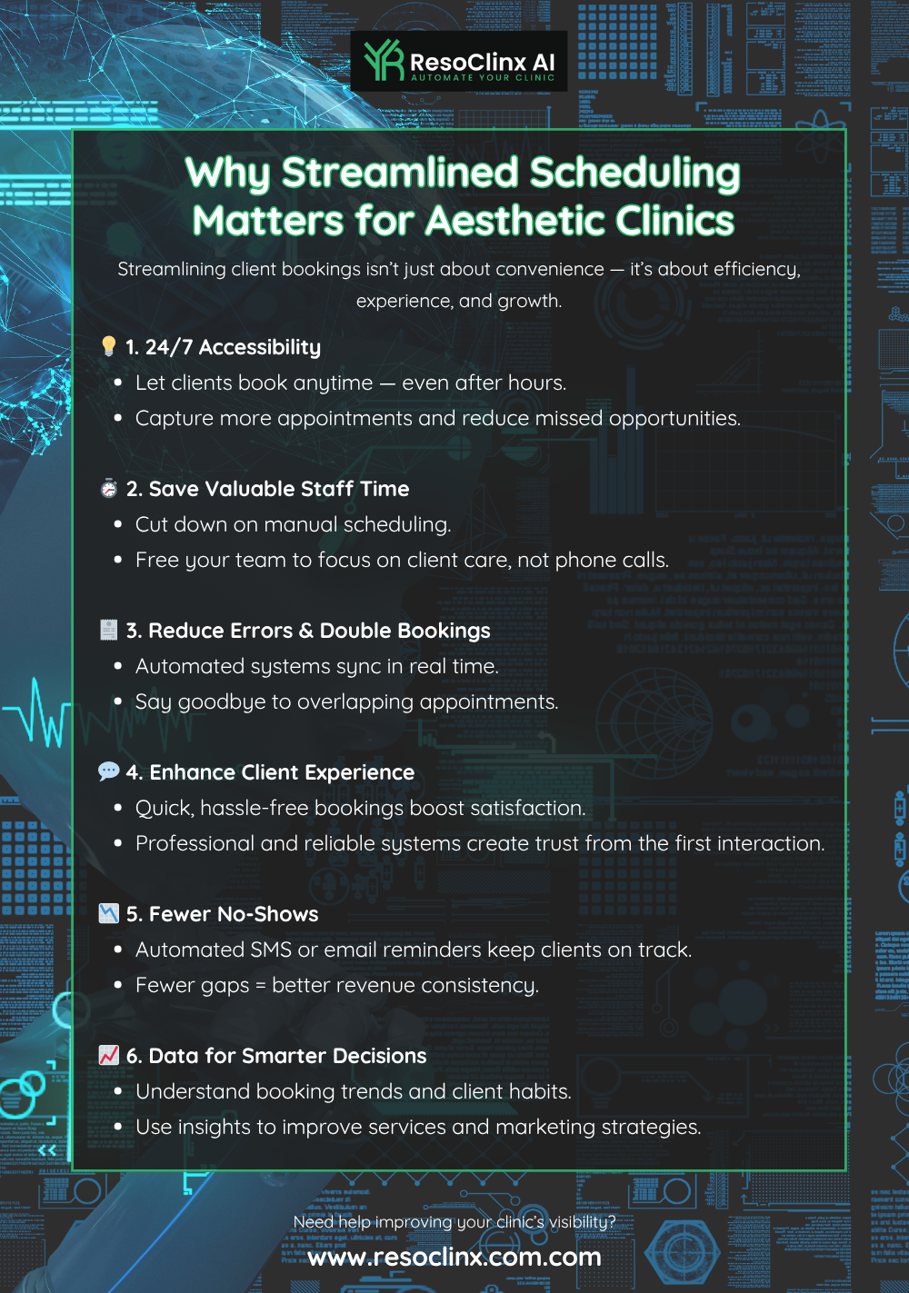 Investing in an automated appointment system helps prevent missed calls, double bookings, and wasted time — freeing your team to focus on delivering an exceptional aesthetic experience. Even small operational improvements can make a significant difference to client loyalty and clinic growth.