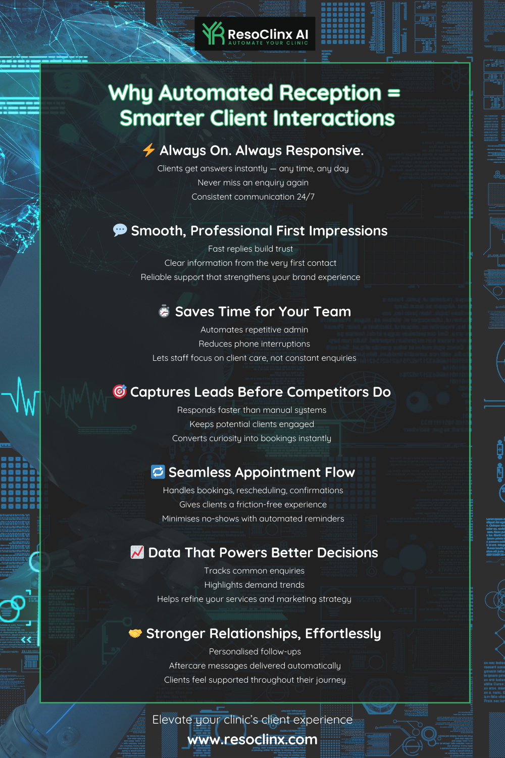 In a fast-paced digital world, clients expect convenience and immediacy. When calls go unanswered or responses are delayed, clinics risk losing potential clients to competitors. An automated receptionist bridges this gap by ensuring your clinic remains responsive at all times — not only during working hours.