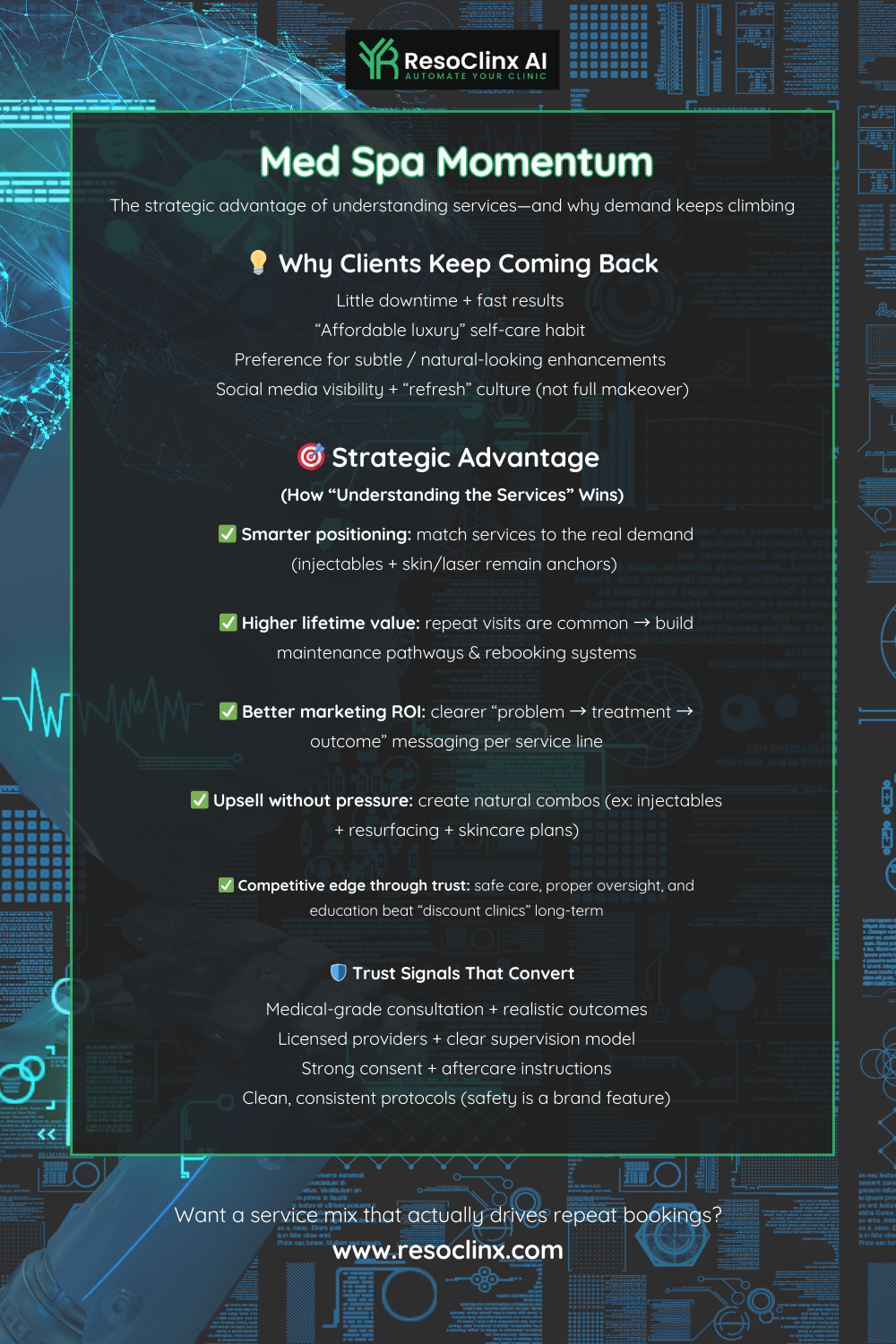 A quick visual breakdown of what’s driving med spa demand today—plus the key services and business insights that help brands earn trust, keep clients returning, and grow sustainably.