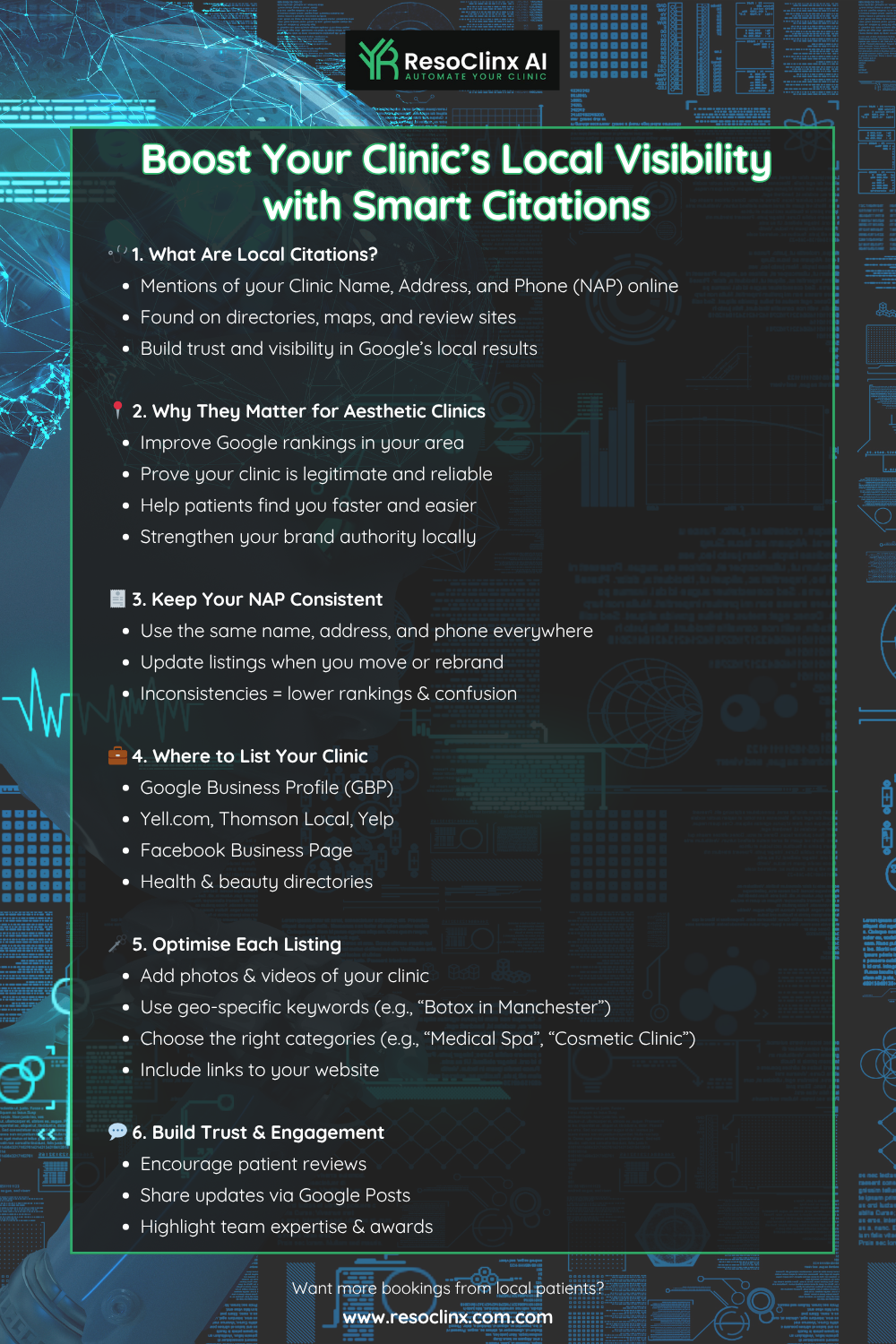 In today’s digital world, having a strong online presence is no longer optional for aesthetic clinics; it’s a necessity. Whether you’re a solo practitioner or part of a larger practice, appearing prominently in local search results is key to attracting new patients. At the heart of a successful local search strategy are local citations. These are essentially online mentions of your clinic’s name, address, and phone number (NAP). They appear across various platforms, from general business directories to niche health websites and mapping services.