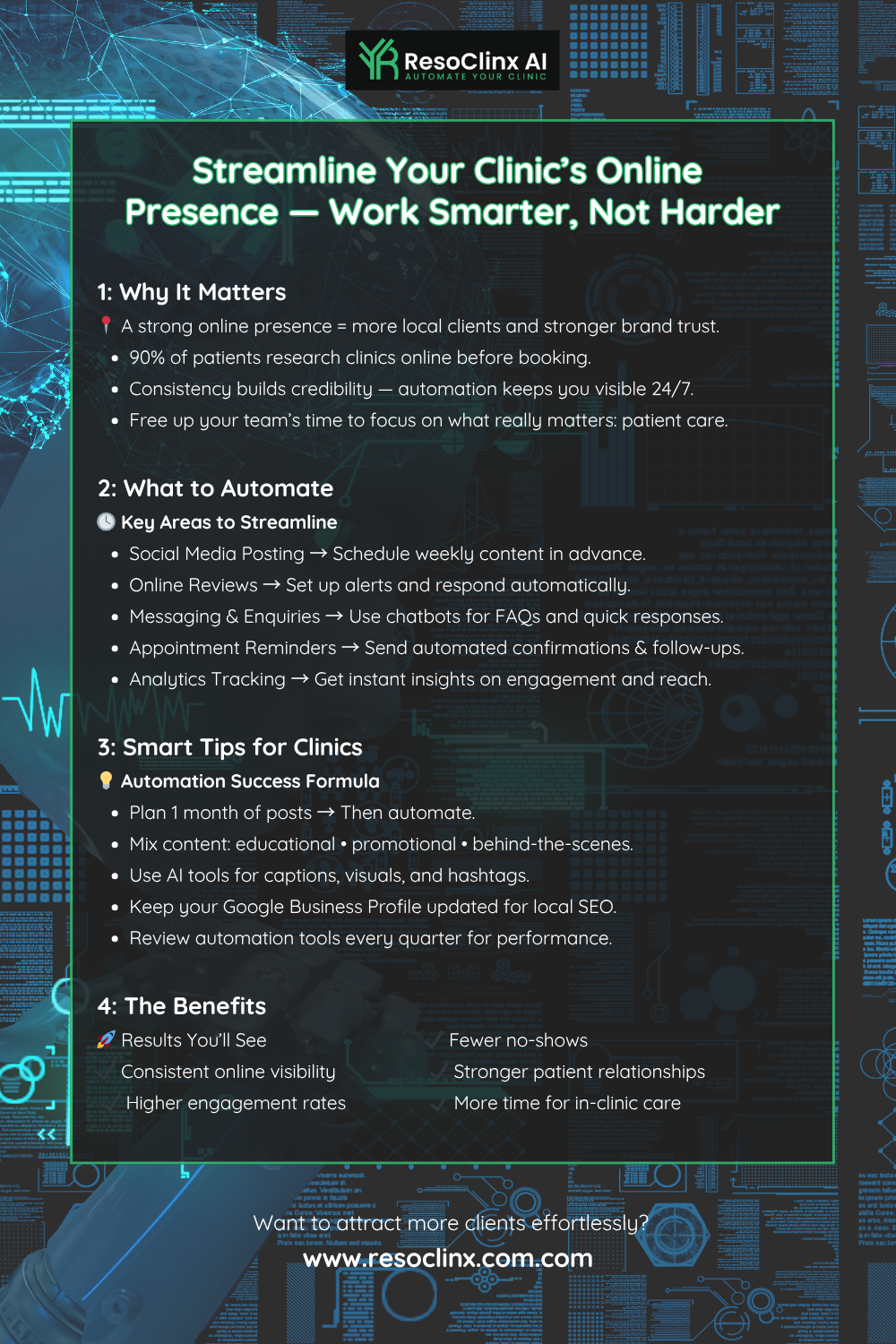Automation can really help with this, making sure your clinic stays visible and engaging without you having to be online all the time.